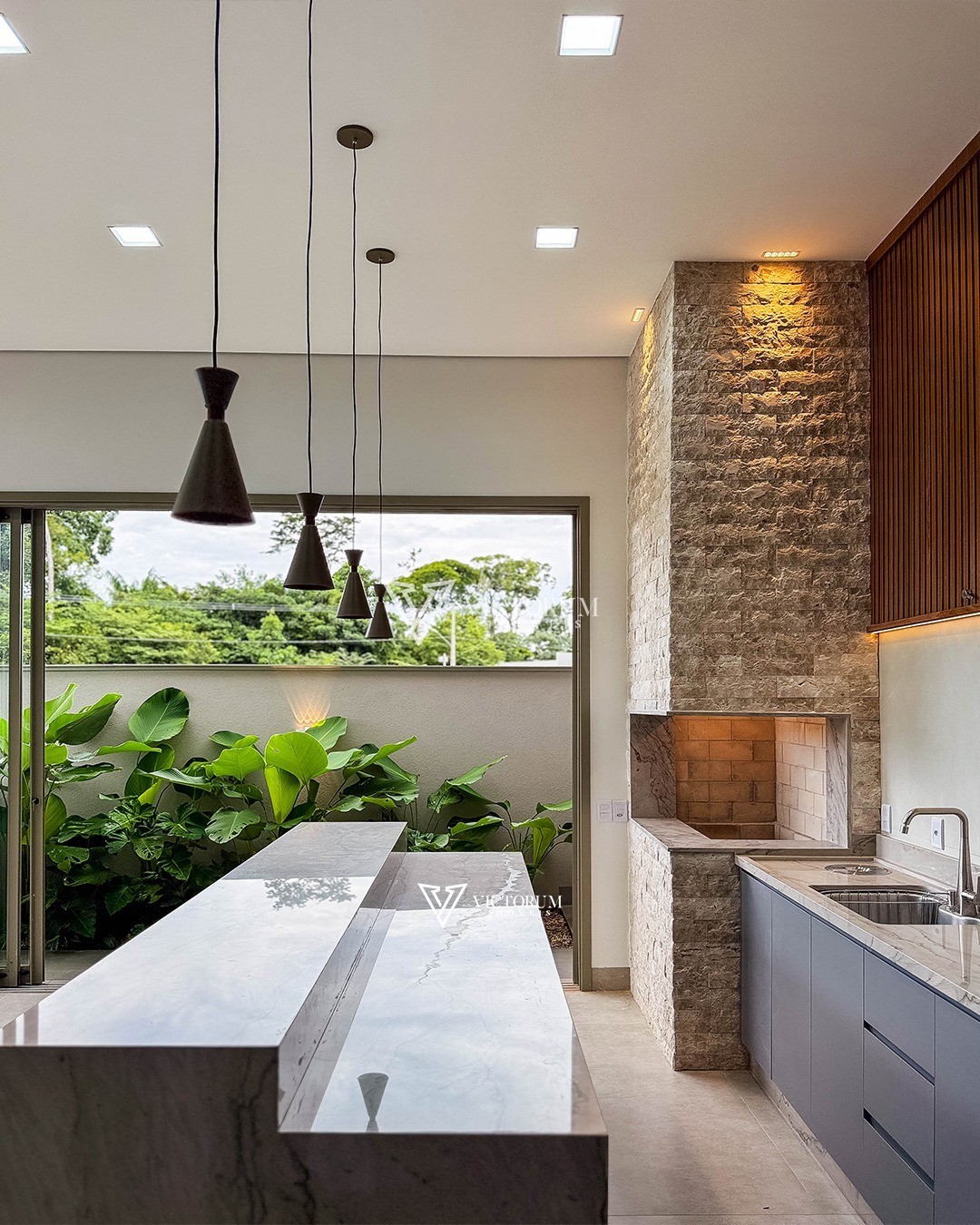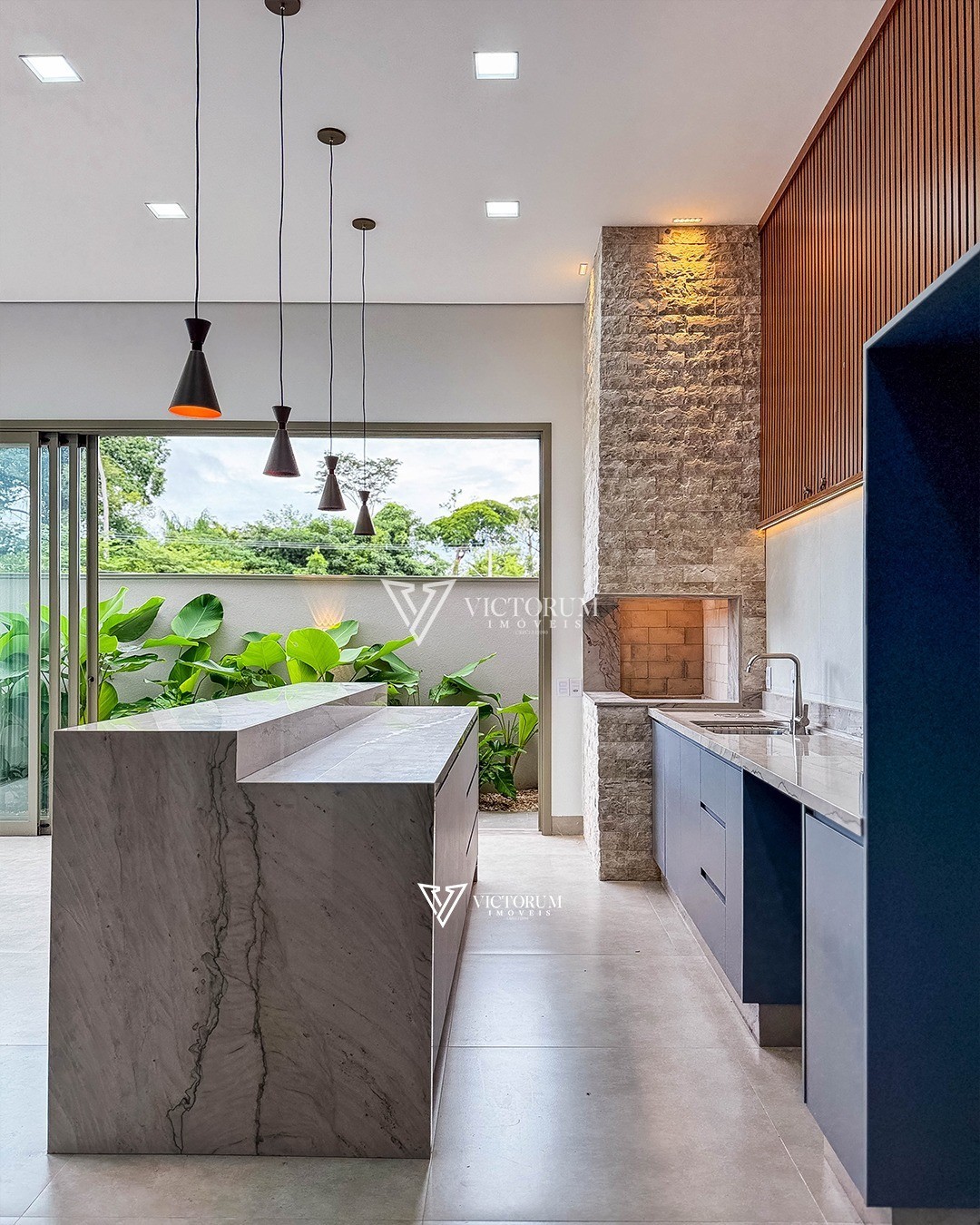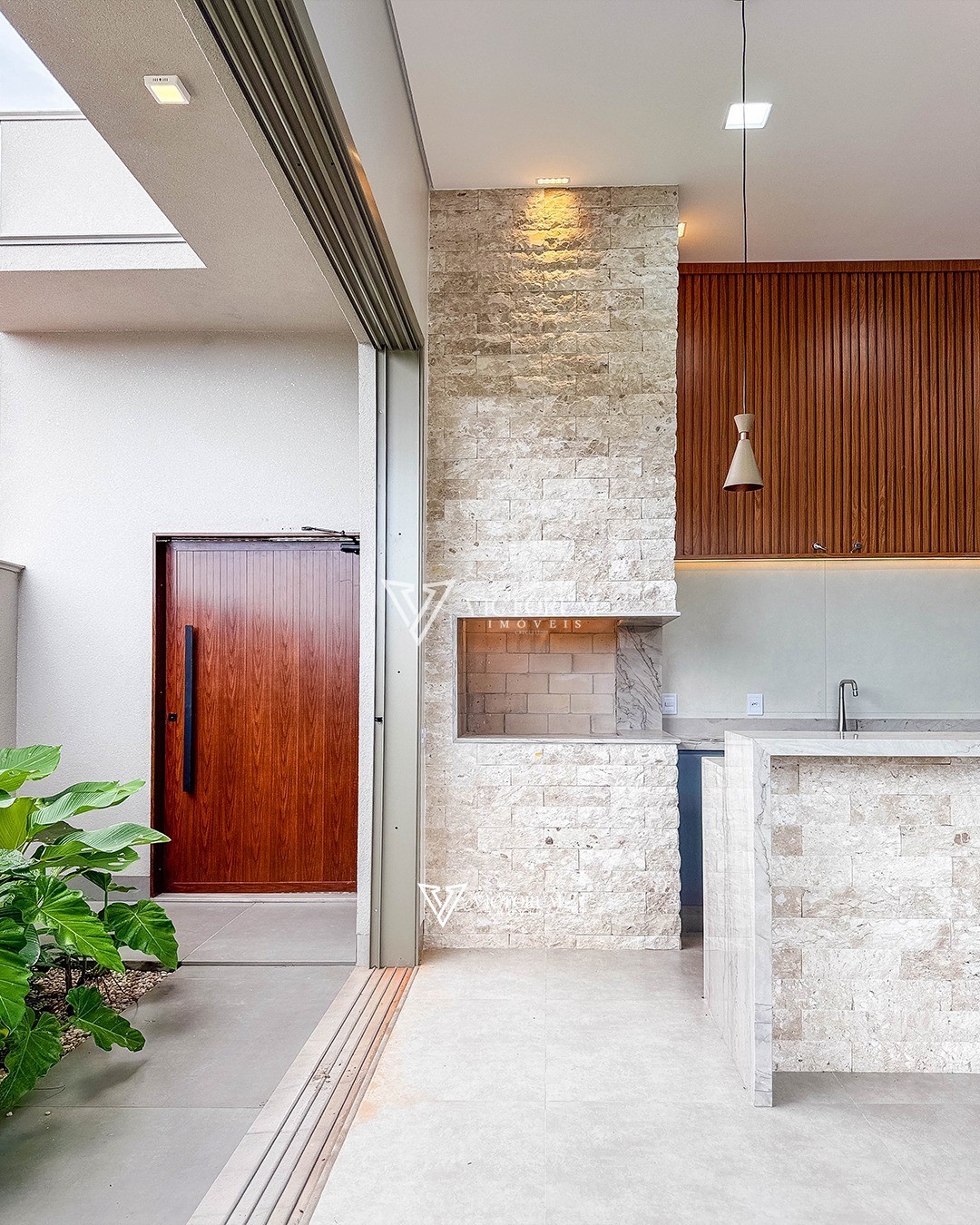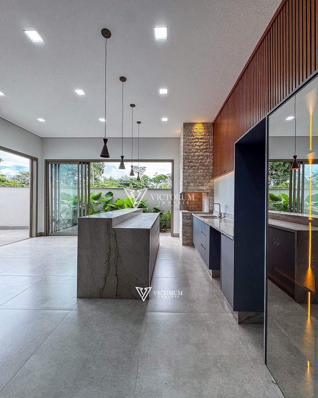 * Cozinha e área gourmet integradas (com coifa e fogão)