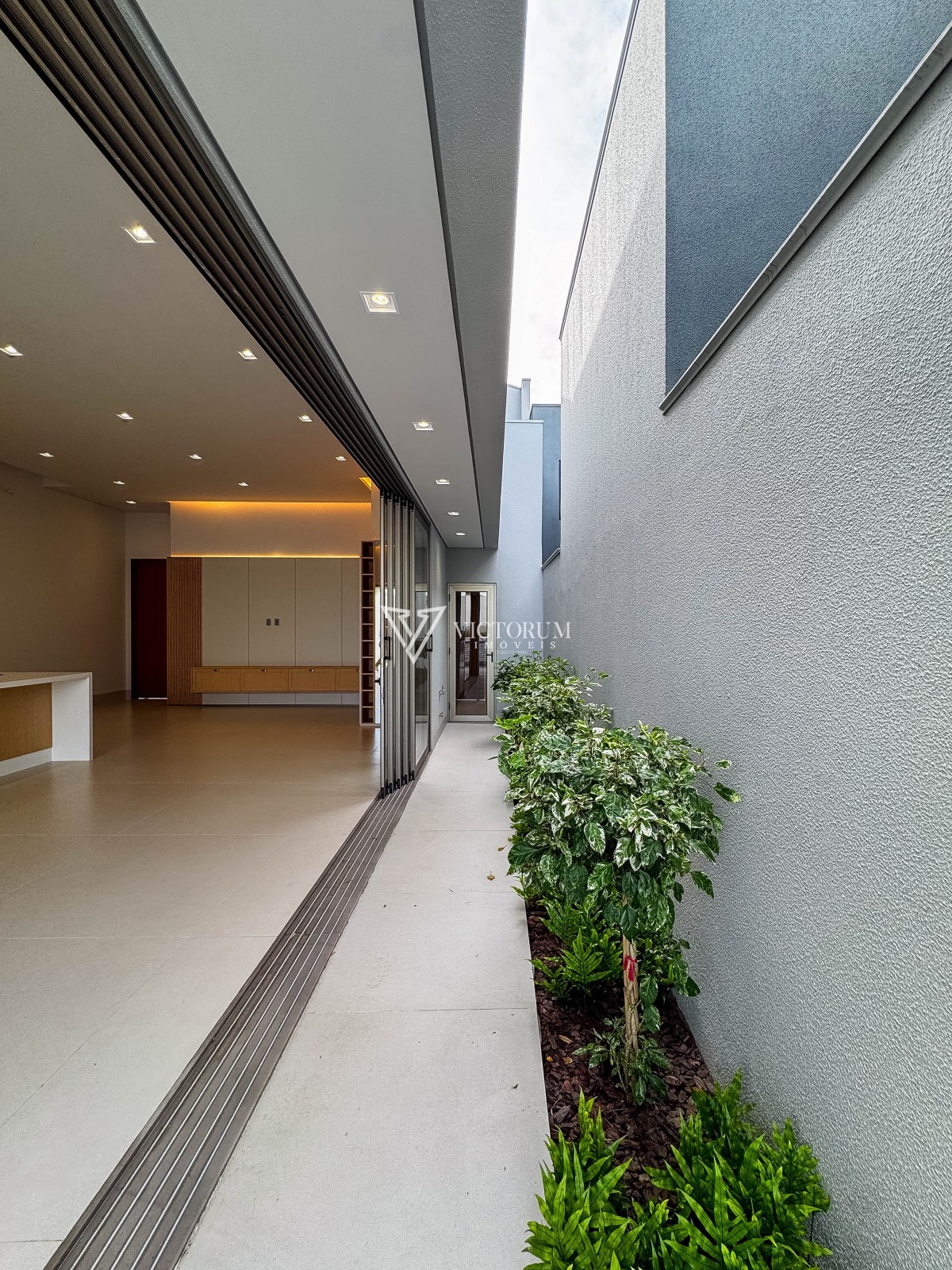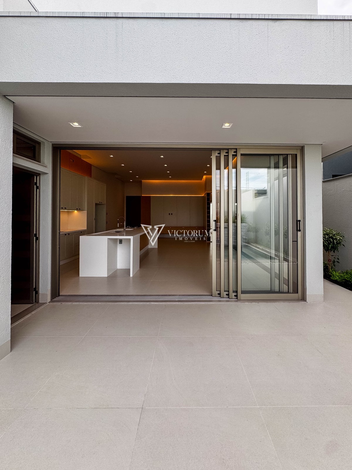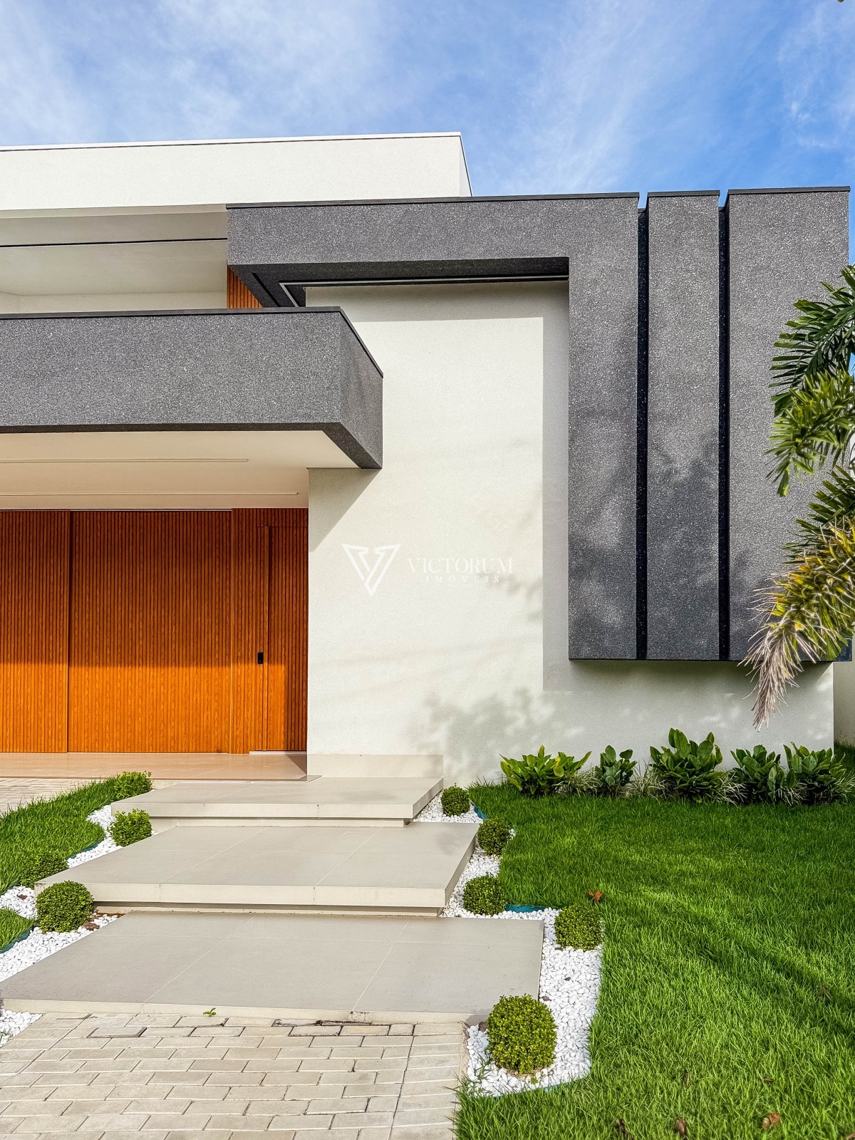 Área externa com avanço coberto, calçada revestida em porcelanato e jardinagem integrada ao espaço gourmet e à garagem.