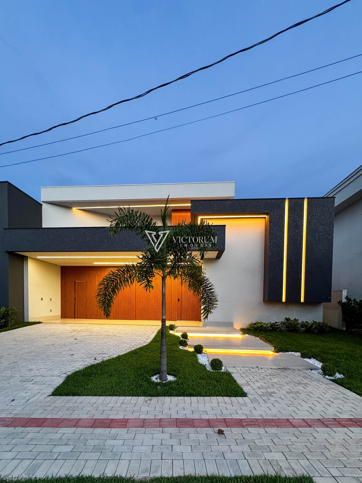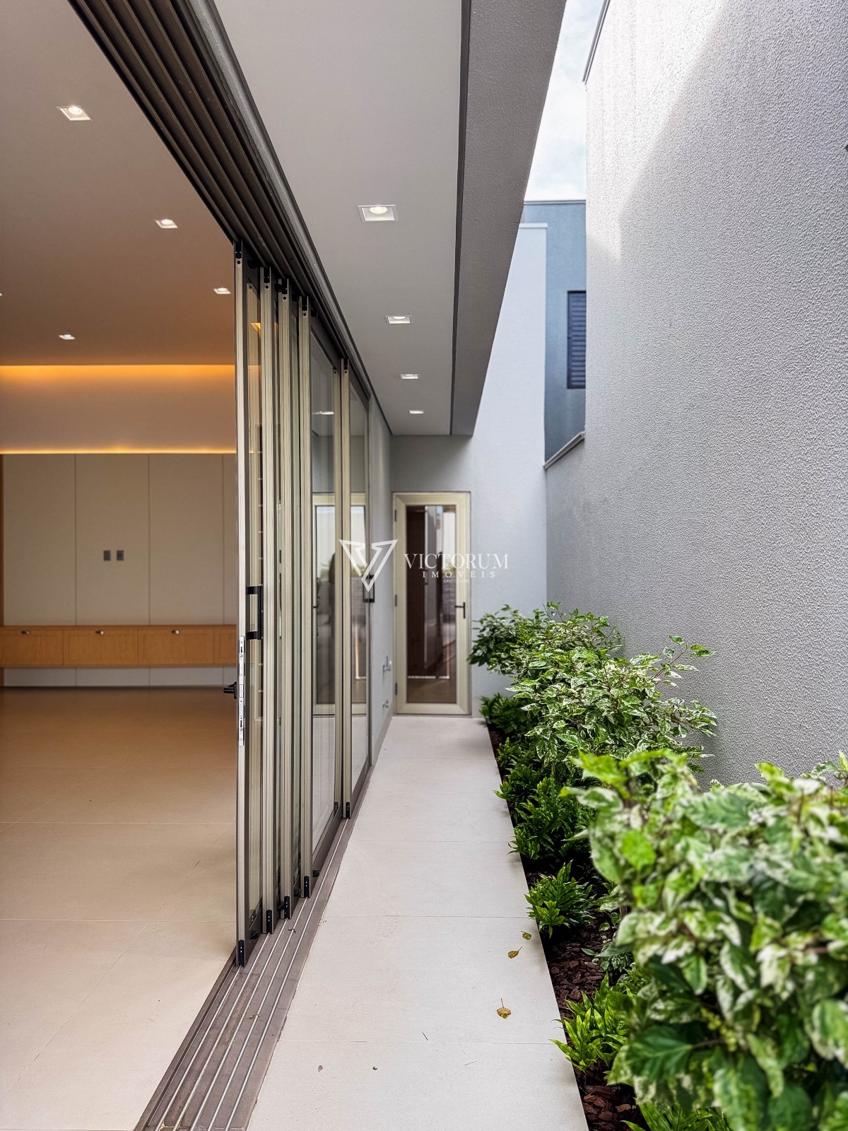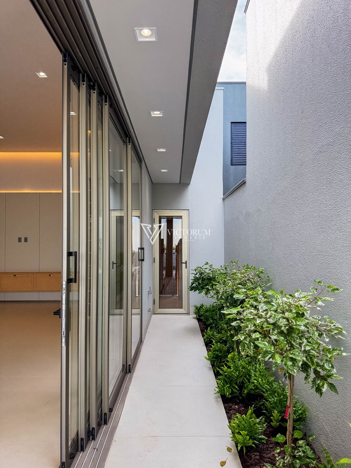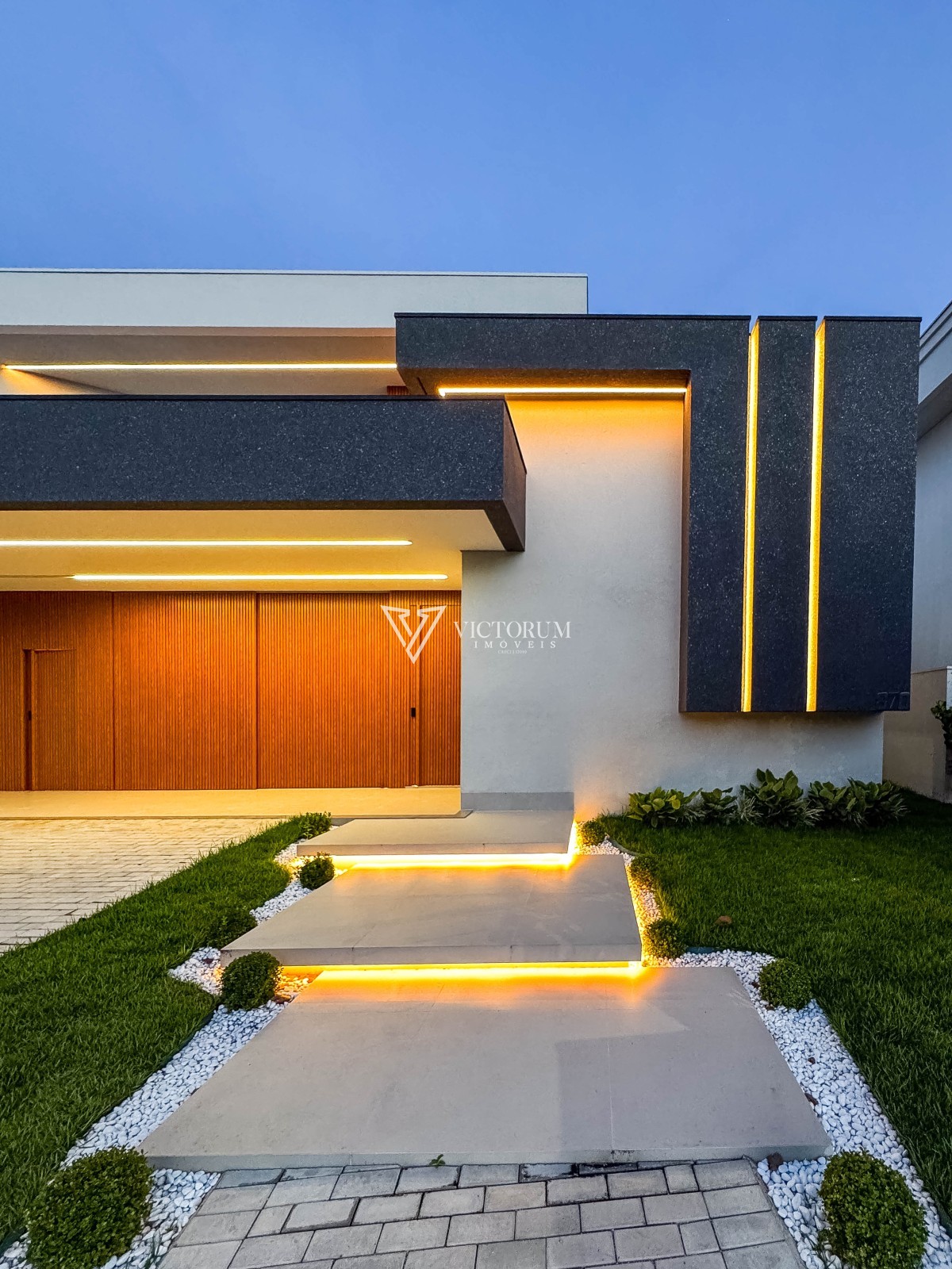 Área externa com avanço coberto, calçada revestida em porcelanato e jardinagem integrada ao espaço gourmet e à garagem.
