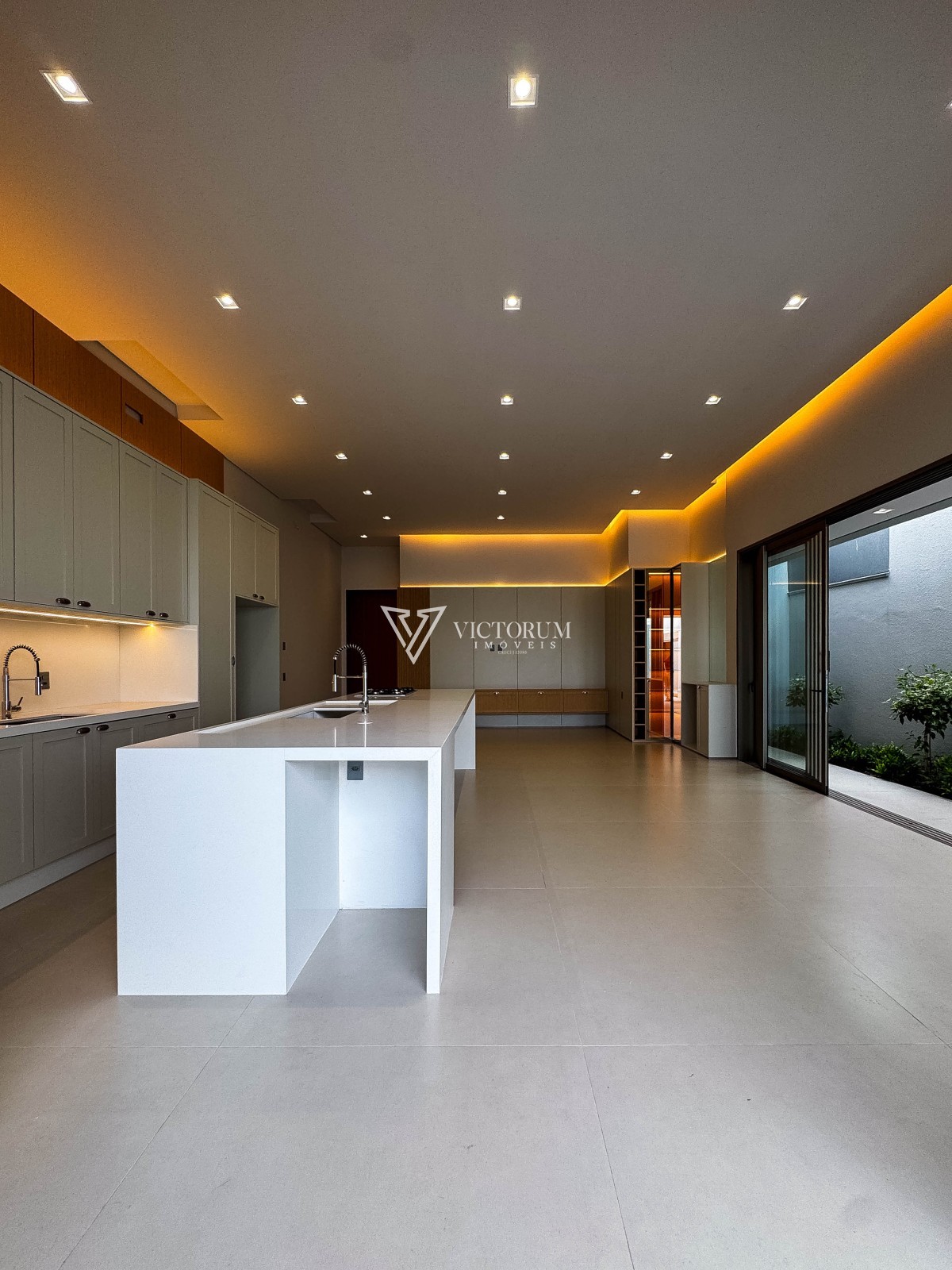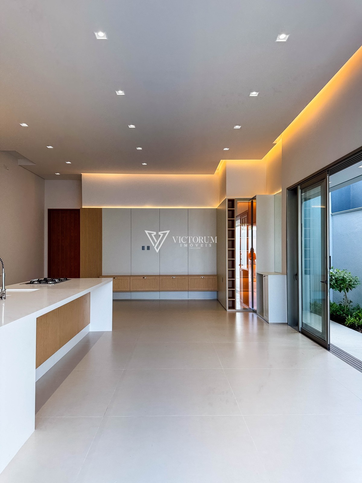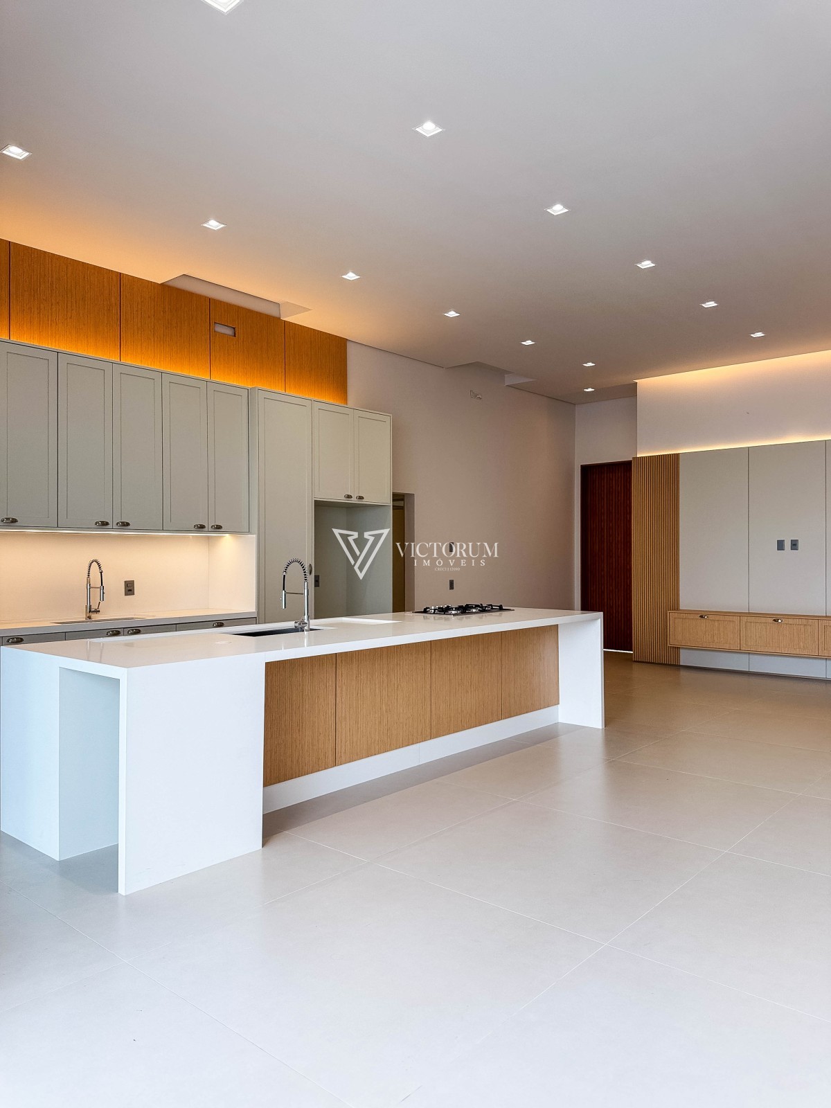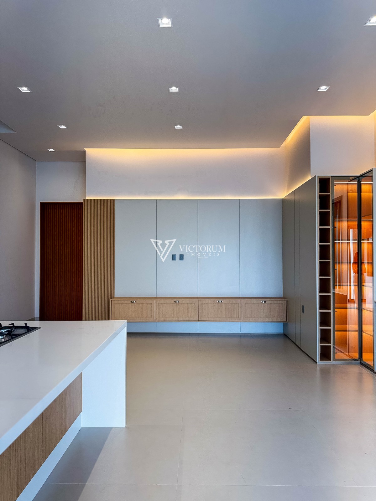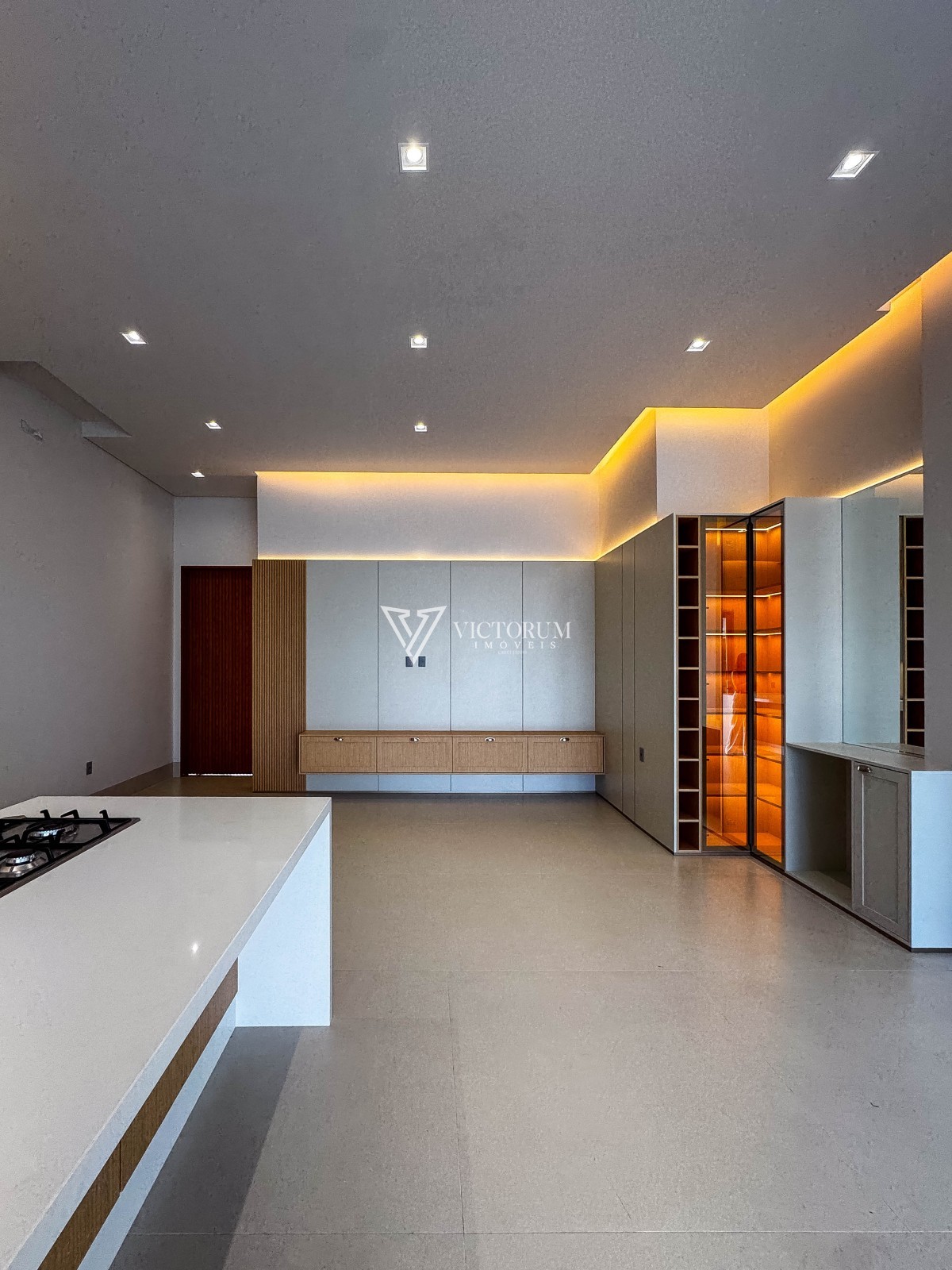 Sala integrada à cozinha gourmet, com móveis planejados;