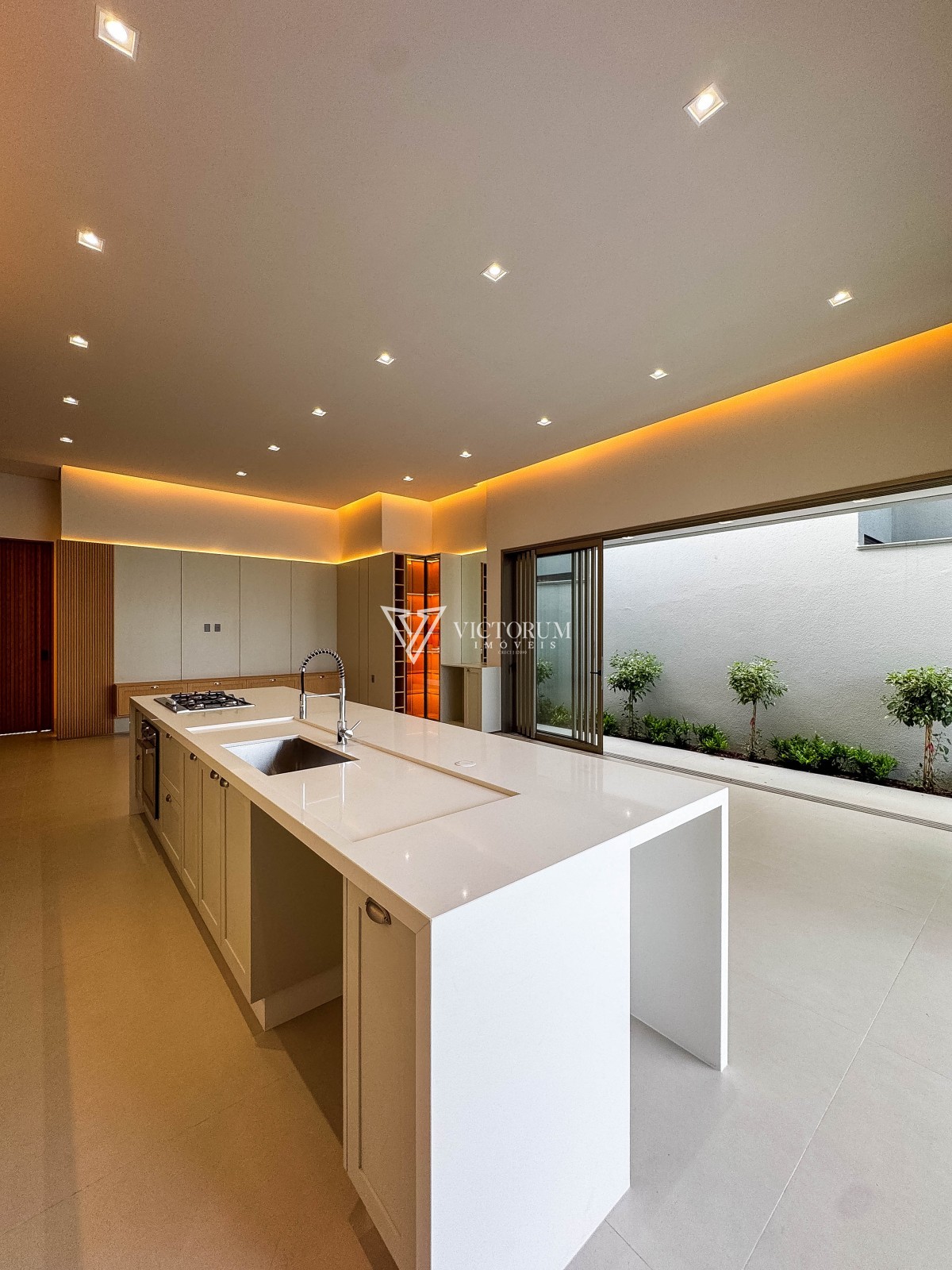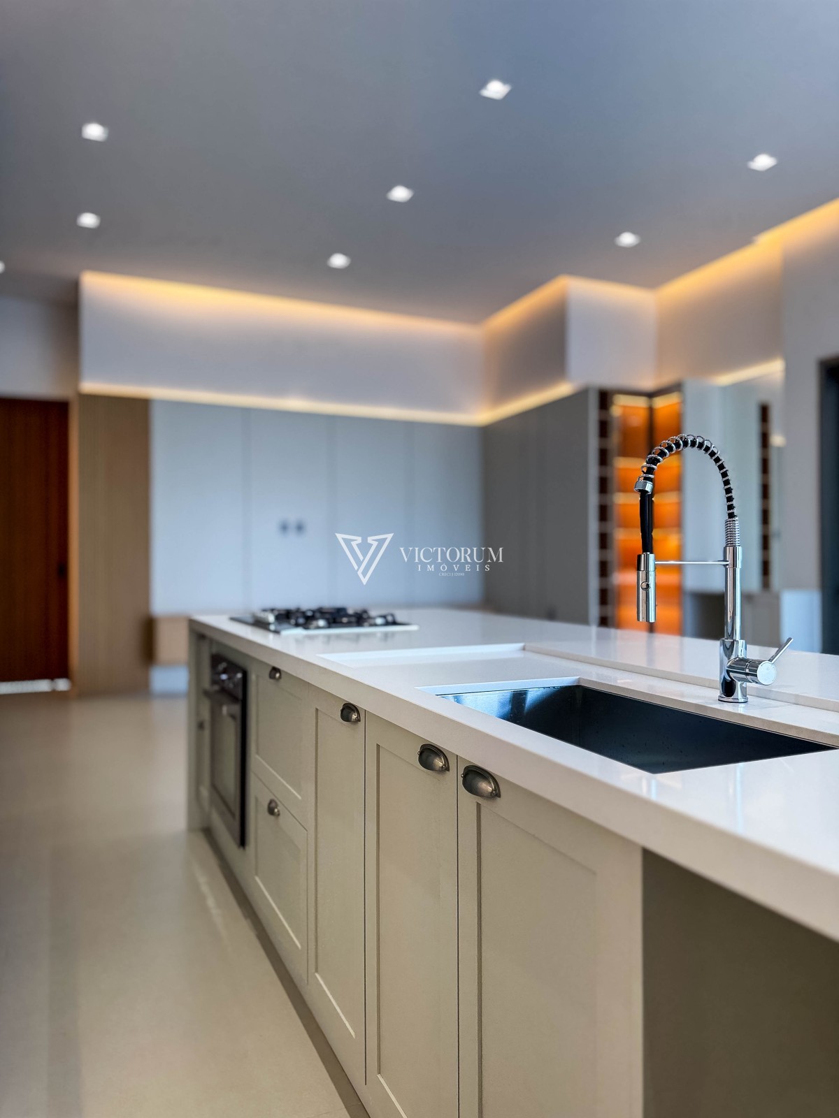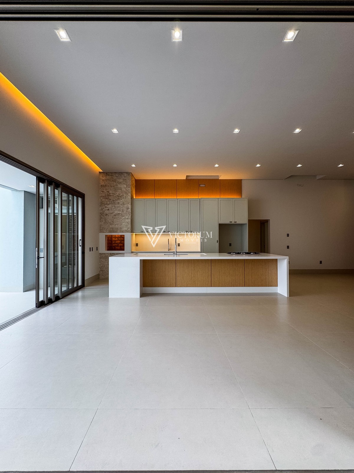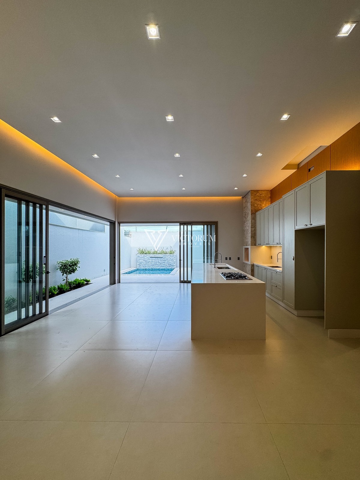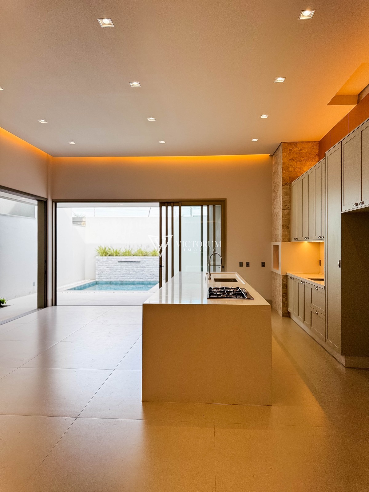 Sala integrada à cozinha gourmet, com móveis planejados;