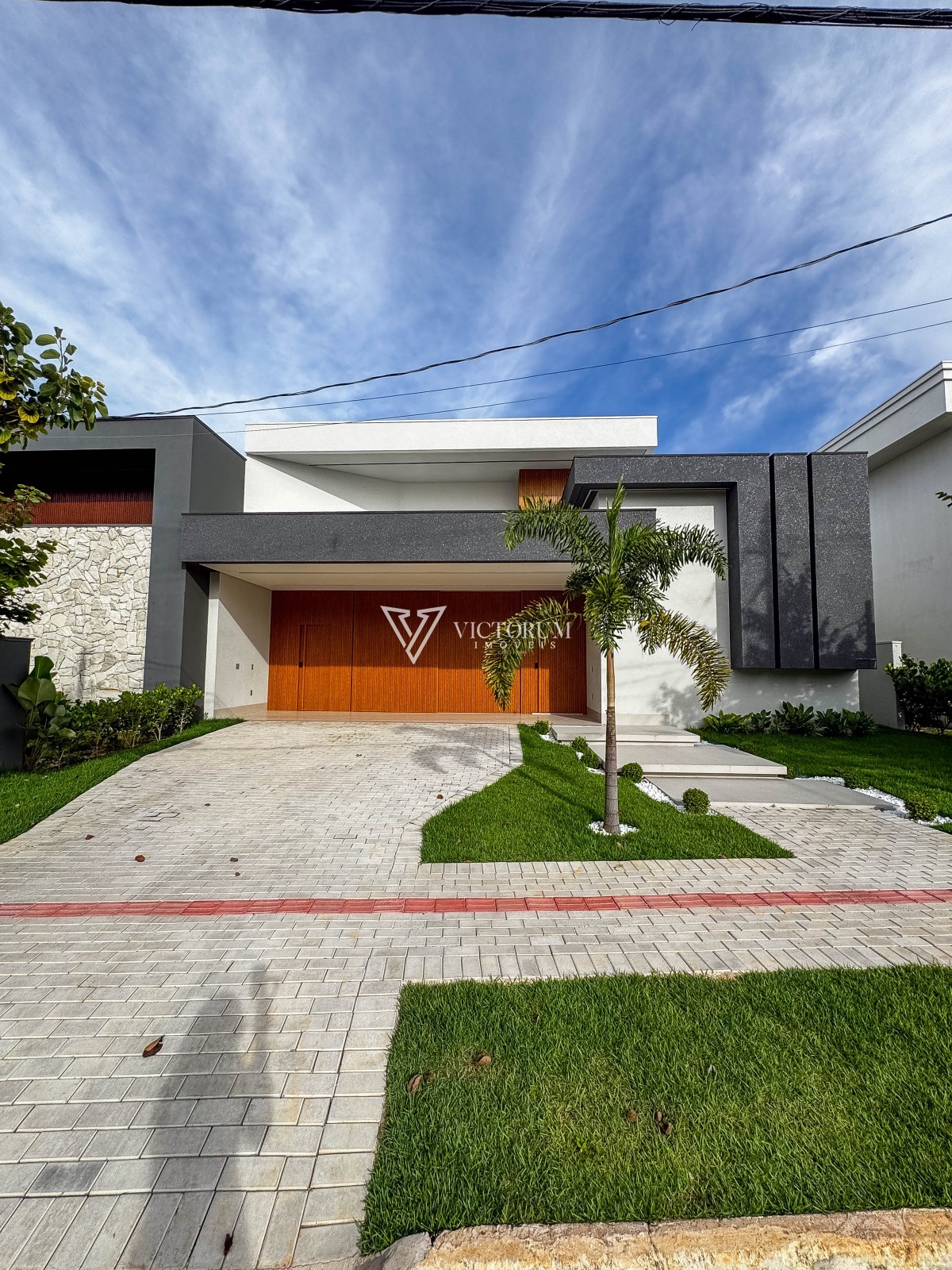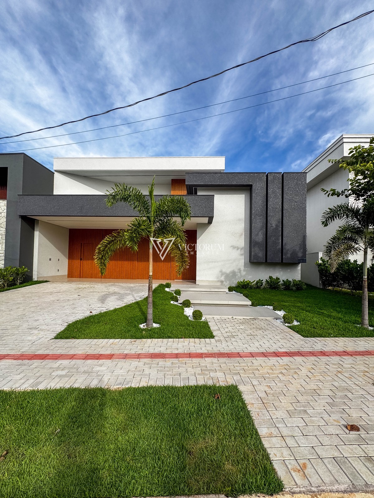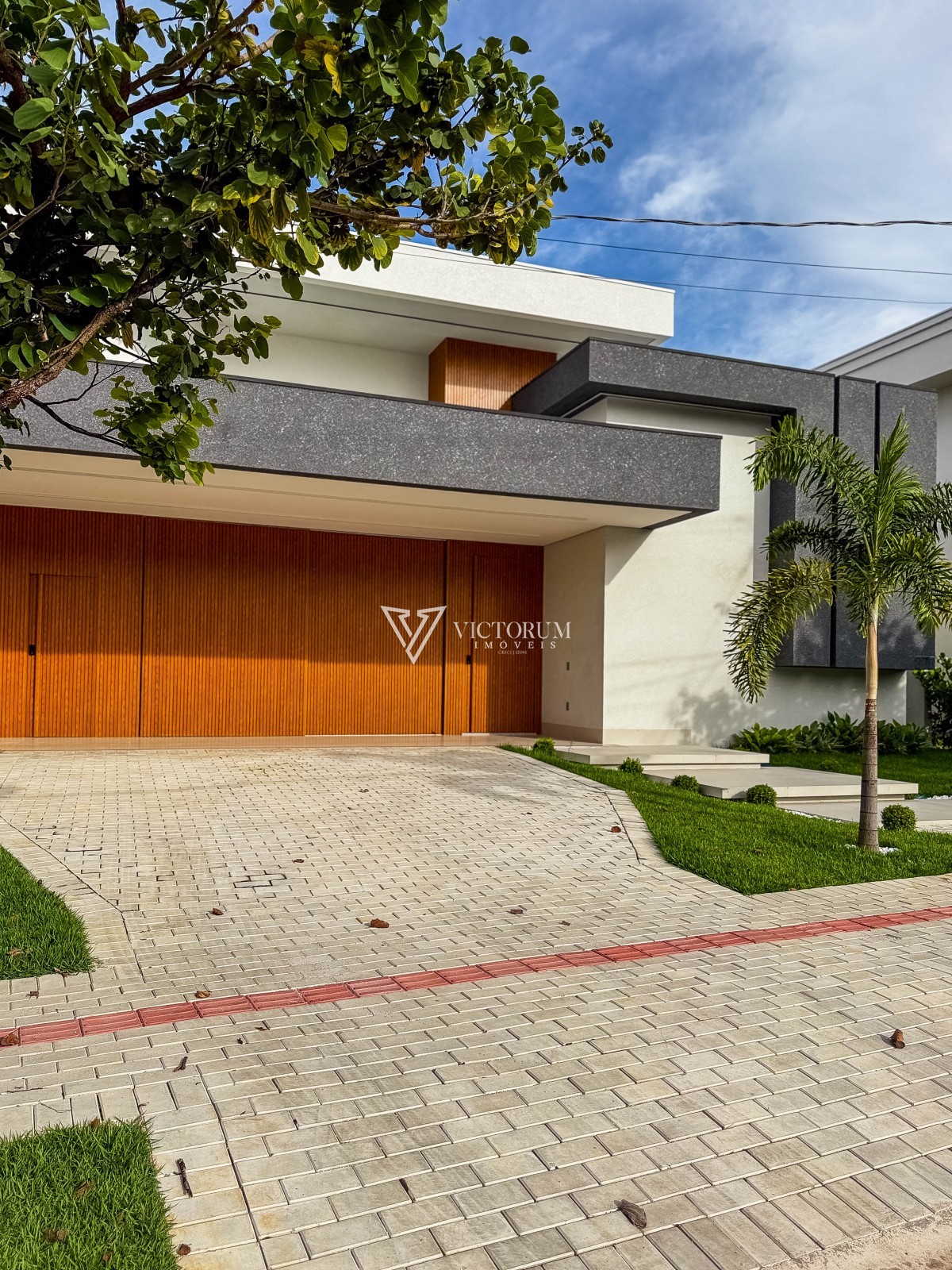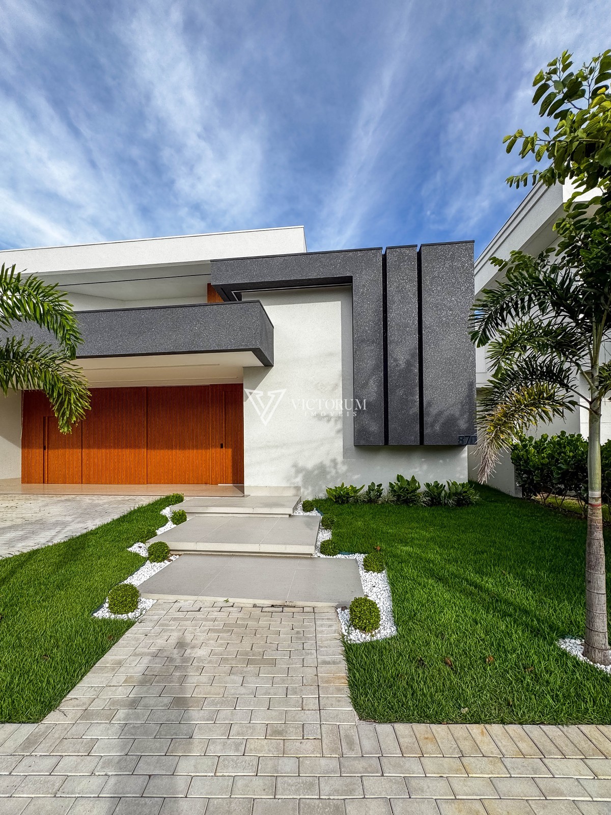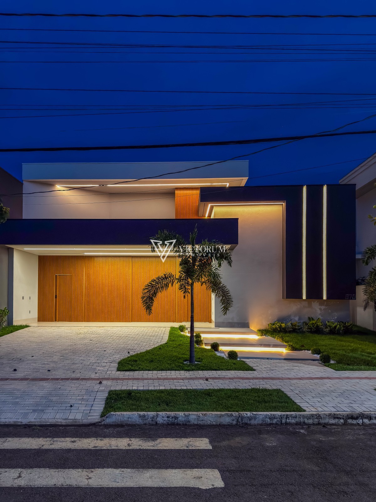 Porta principal e painel da fachada em alumínio na cor amadeirado.